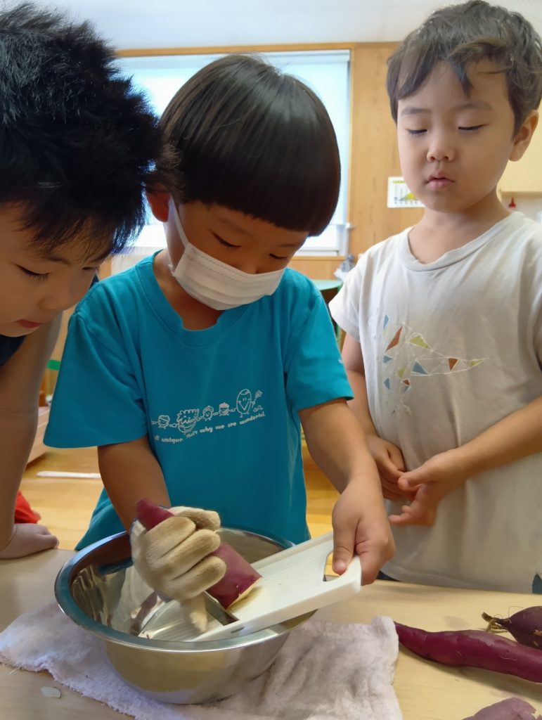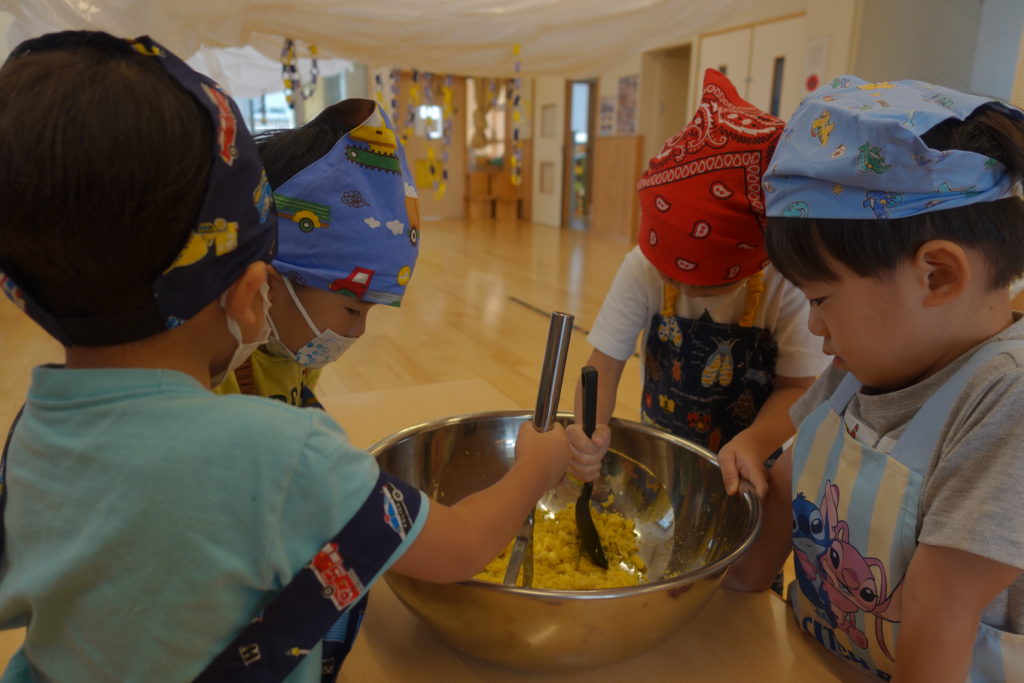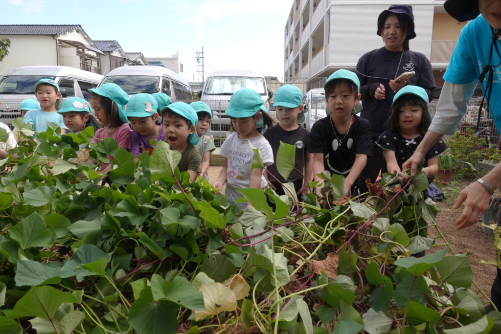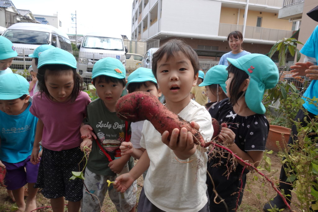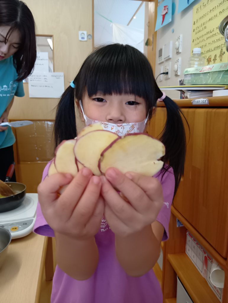 子どもたちが園庭にさつまいもを植え、いもほりを行い、そのおいもを使っておやつをつくり、お芋パーティーを開催しました。