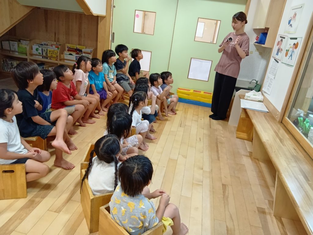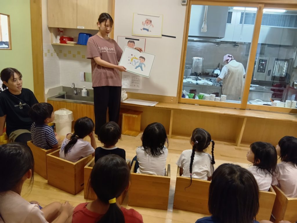 まずは、昨年もしたので思い出すためにもおさらいから。赤、黄、緑の3色に分けた食品それぞれにどんな働きがあるのかをみんなでお話しました。「赤色は筋肉」などと覚えている子もいましたよ。